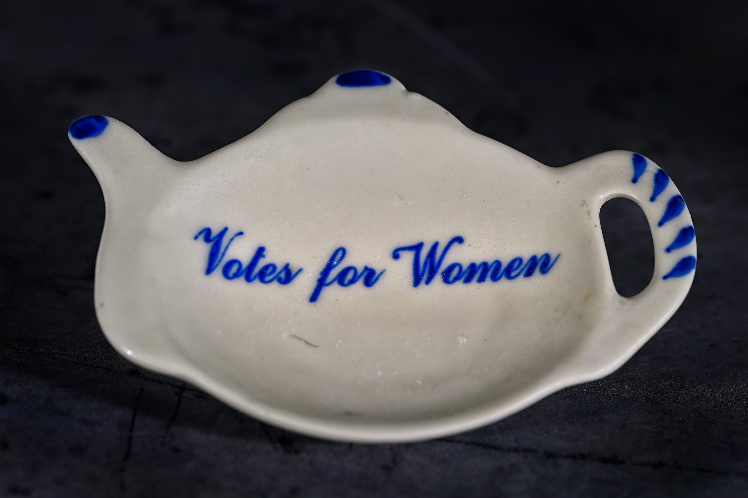 An item that came through completely unscathed was a turquoise-painted hope chest I got from Buy Nothing. There it sat, next to a melted trash can and the incinerated fig tree, as if nothing had happened at all. I couldn’t bring the chest with me to Heather’s studio, obviously, so instead I brought a piece we dug up from the ashes. It’s an intact spoon rest with “Votes for Women” on it, commemorating the plethora of women’s rights and suffrage memorabilia I’ve collected over the years.